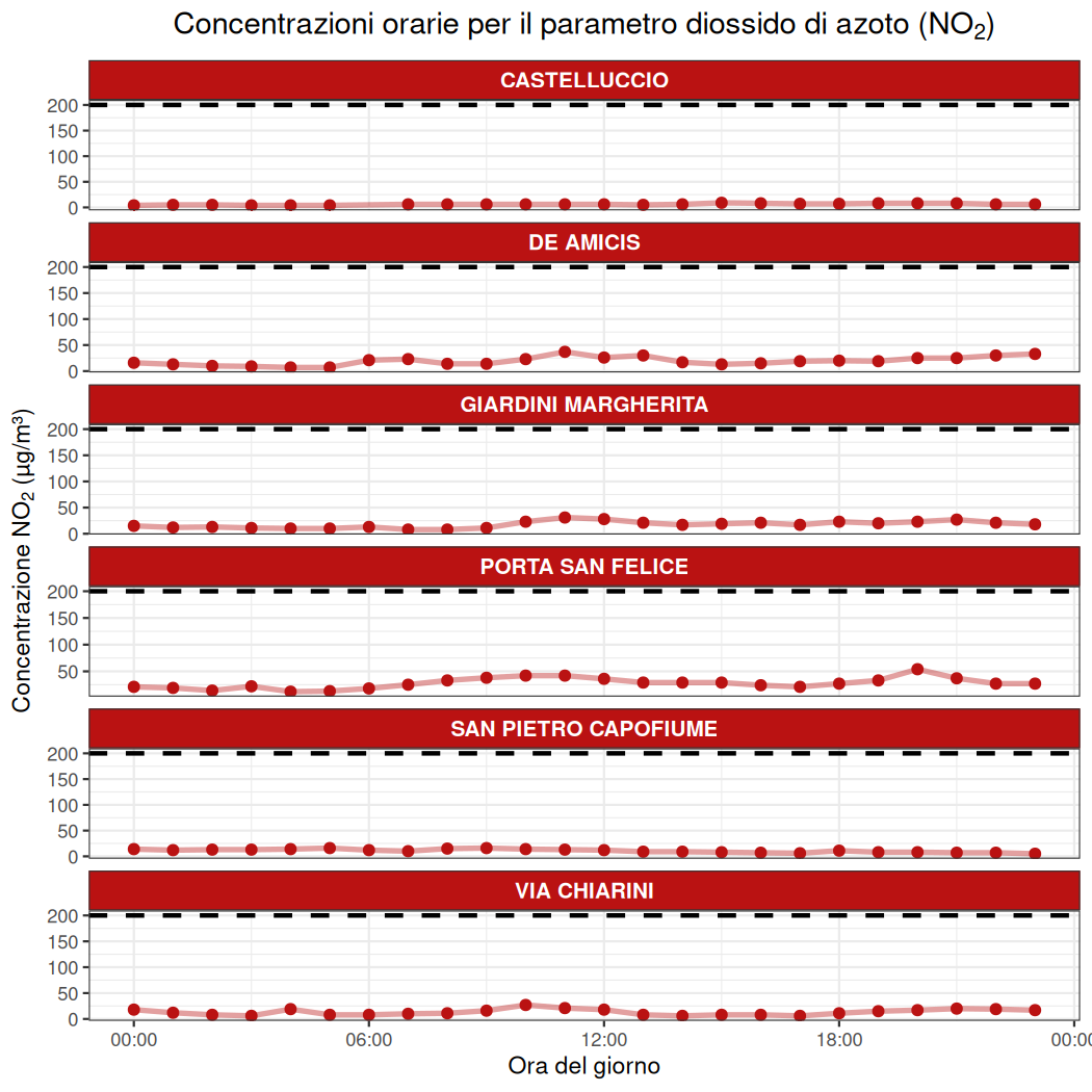 - Non si registrano superamenti del limite di 400 µg/m³ per tre ore consecutive presso le stazioni di misura considerate.