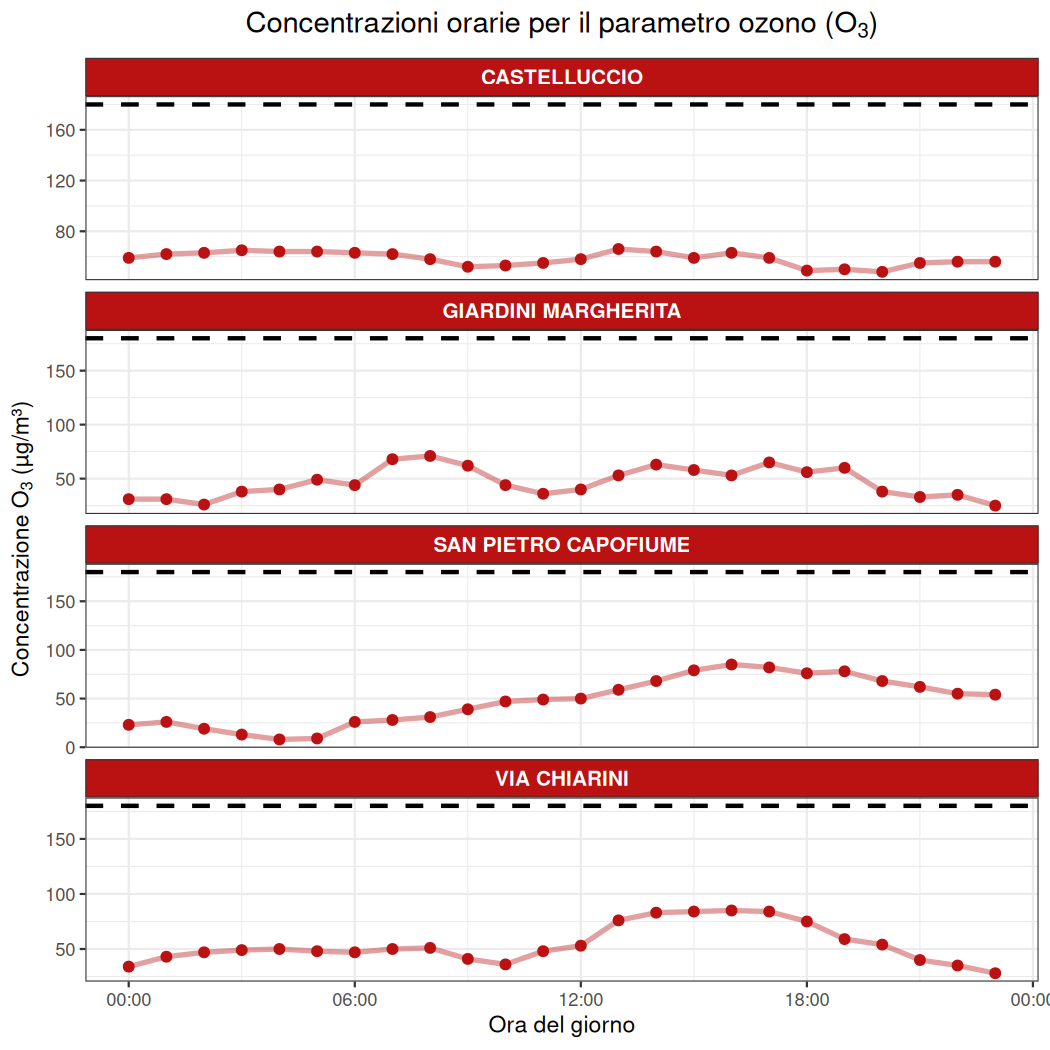 - Non si registrano superamenti del valore obiettivo di 120 µg/m³ (massima media mobile - MA - sulle 8 ore) presso le stazioni di misura considerate.