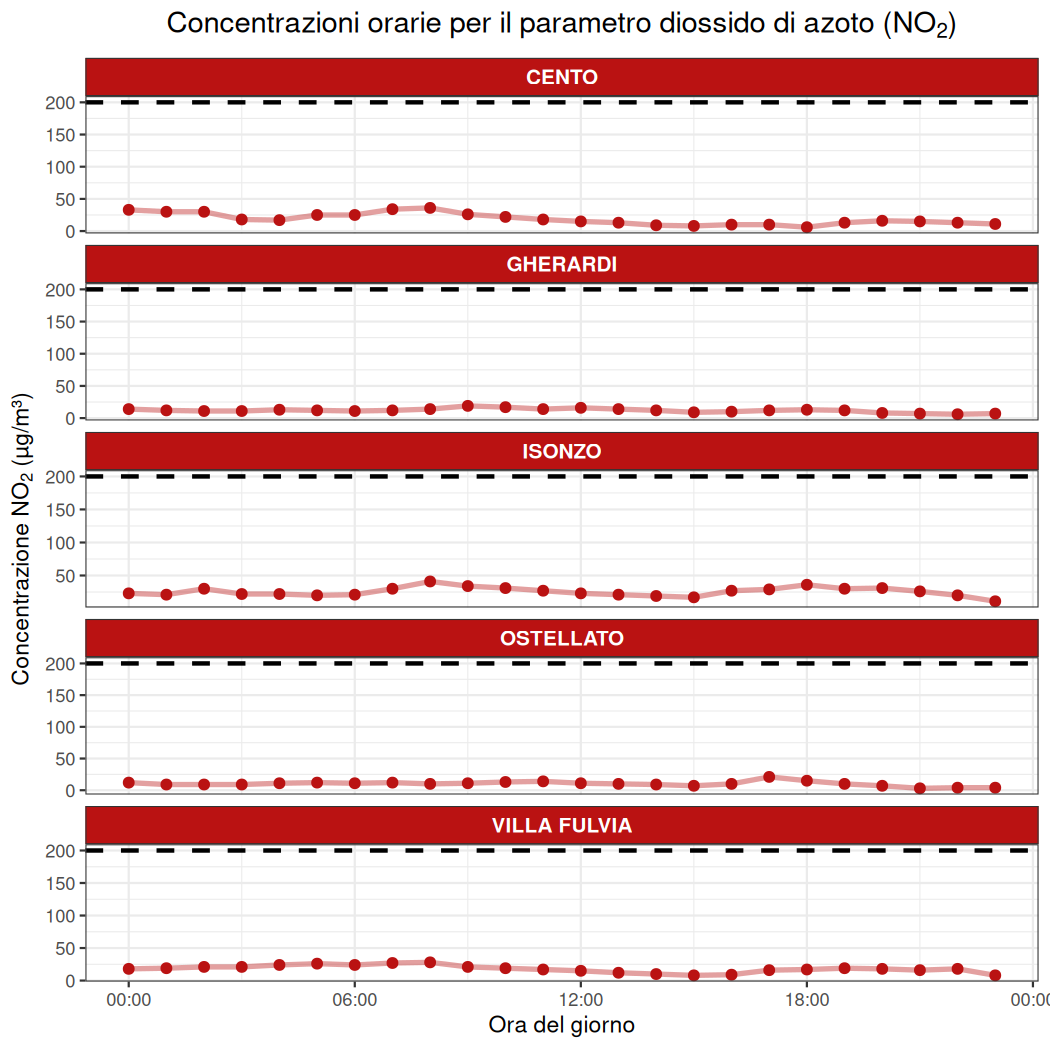 - Non si registrano superamenti del limite di 400 µg/m³ per tre ore consecutive presso le stazioni di misura considerate.