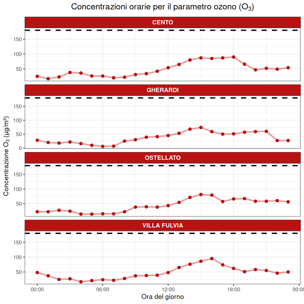 - Non si registrano superamenti del valore obiettivo di 120 µg/m³ (massima media mobile - MA - sulle 8 ore) presso le stazioni di misura considerate.