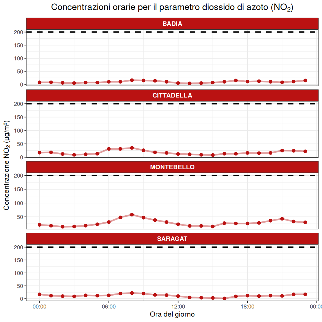 - Non si registrano superamenti del limite orario di 200 µg/m³ presso le stazioni di misura considerate.