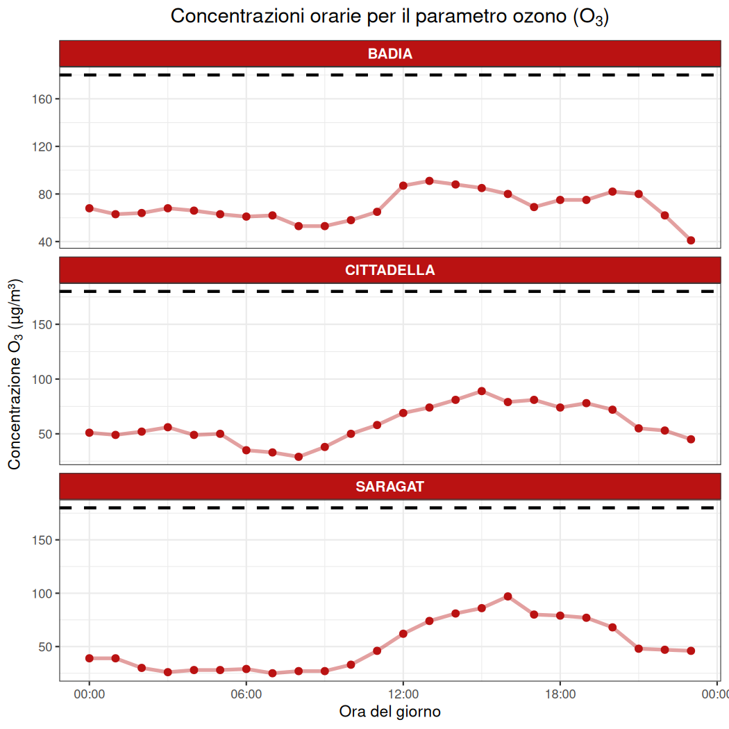 - Non si registrano superamenti del valore obiettivo di 120 µg/m³ (massima media mobile - MA - sulle 8 ore) presso le stazioni di misura considerate.