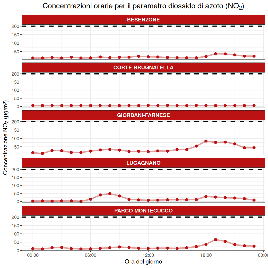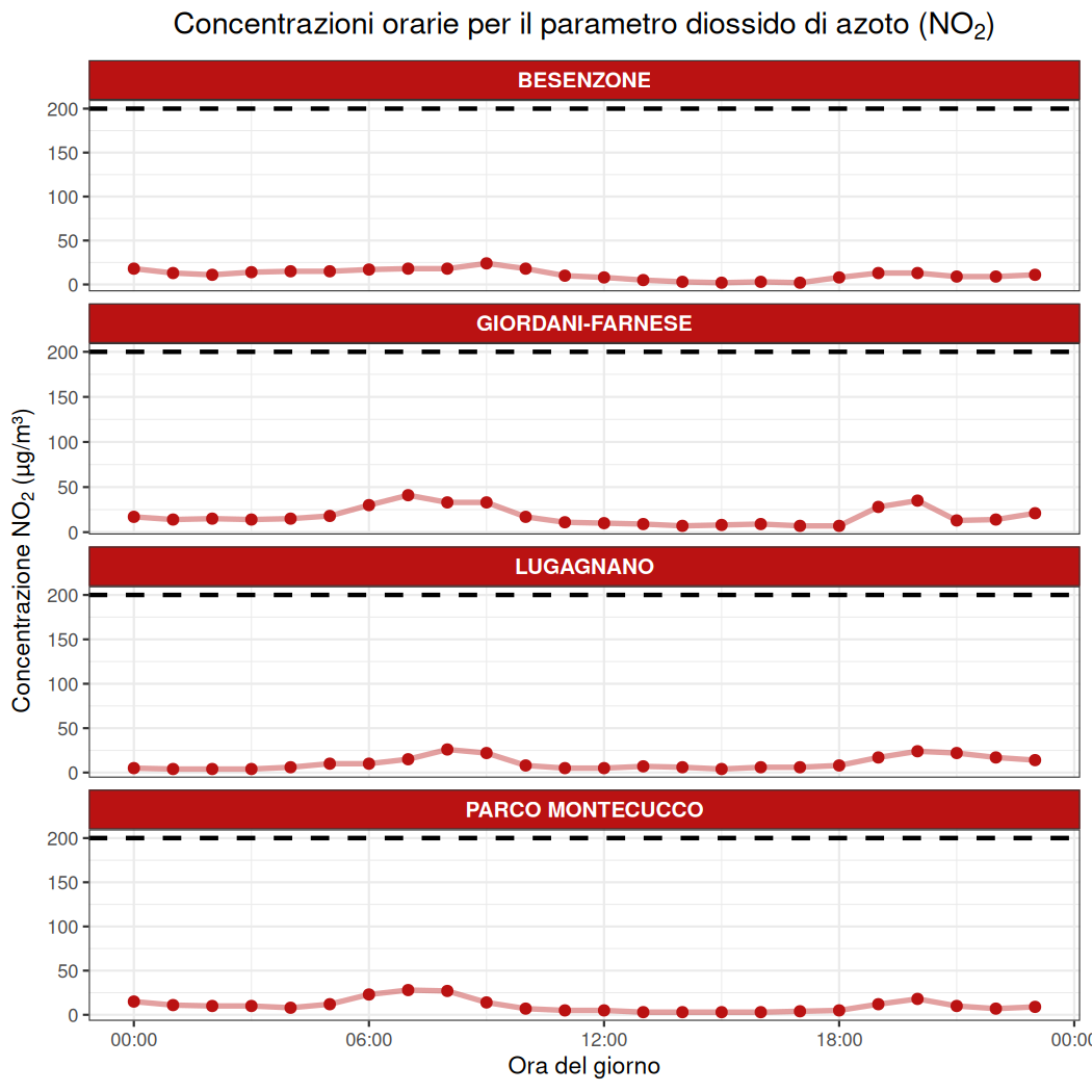 - Non si registrano superamenti del limite orario di 200 µg/m³ presso le stazioni di misura considerate.