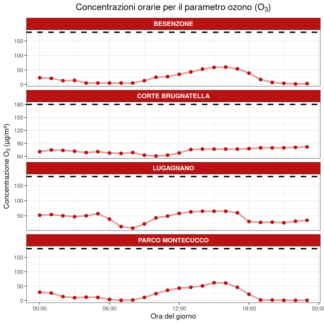 - Non si registrano superamenti del valore obiettivo di 120 µg/m³ (massima media mobile - MA - sulle 8 ore) presso le stazioni di misura considerate.