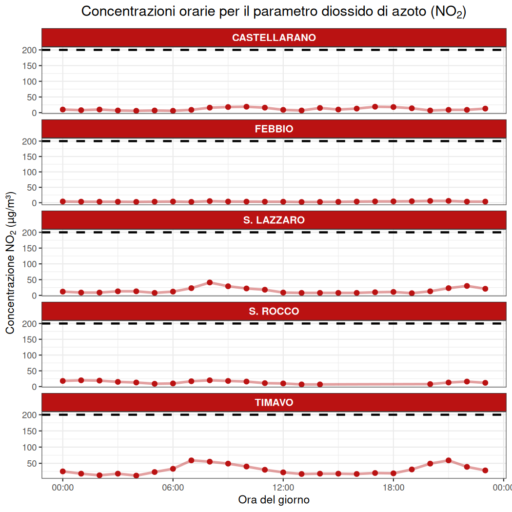 - Non si registrano superamenti del limite orario di 200 µg/m³ presso le stazioni di misura considerate.